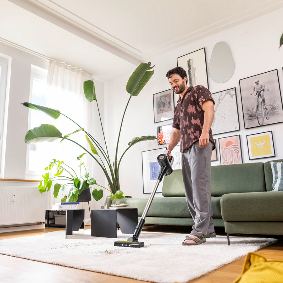 The VCS 3 Nano cordless vacuum cleaner is a compact and powerful assistant for everyday cleaning. Thanks to intelligent dirt detection, the suction power is automatically adjusted to the level of dirt to ensure efficient cleaning and the best possible battery runtime. The Clean Control Display provides information about the current cleaning mode and the level of dirt. Featuring modern BLDC motor technology and optimised sealing of the floor nozzle, it guarantees excellent dust pick-up on all surfaces. The LED lighting on the floor nozzle makes even the finest dirt visible. The 180° swivel joint offers high manoeuvrability and glides smoothly around furniture and into corners. The multi-stage HEPA filter system, which reliably traps 99.9 percent (tested as per EN IEC 62885-4:2020/A1:2023) of the vacuumed particles, ensures clean exhaust air, making the VCS 3 Nano an ideal choice for allergy sufferers. At less than 79 dB, vacuuming can be quiet as a whisper, ideal for households with children or pets. USB-C charging for added convenience and flexibility; plus, the device can be stored in the wall bracket to save space.